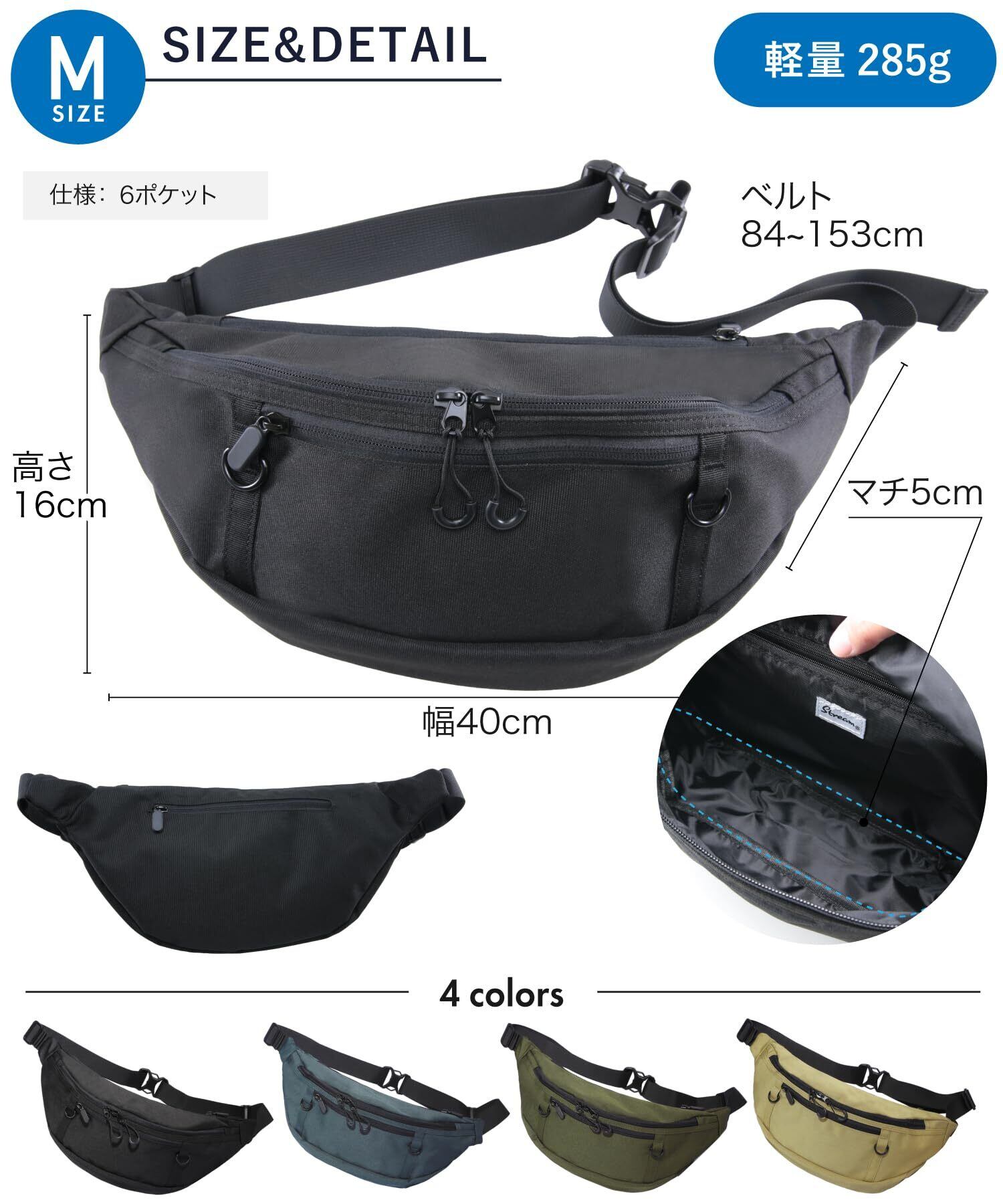 【人気商品】【中身がヌレない】ボディバッグ 防水ポケット搭載 ウエストバッグ 軽量 撥水 6ポケット 500mlペットボトル3本収納 [STREAM] (ブラック, M)
