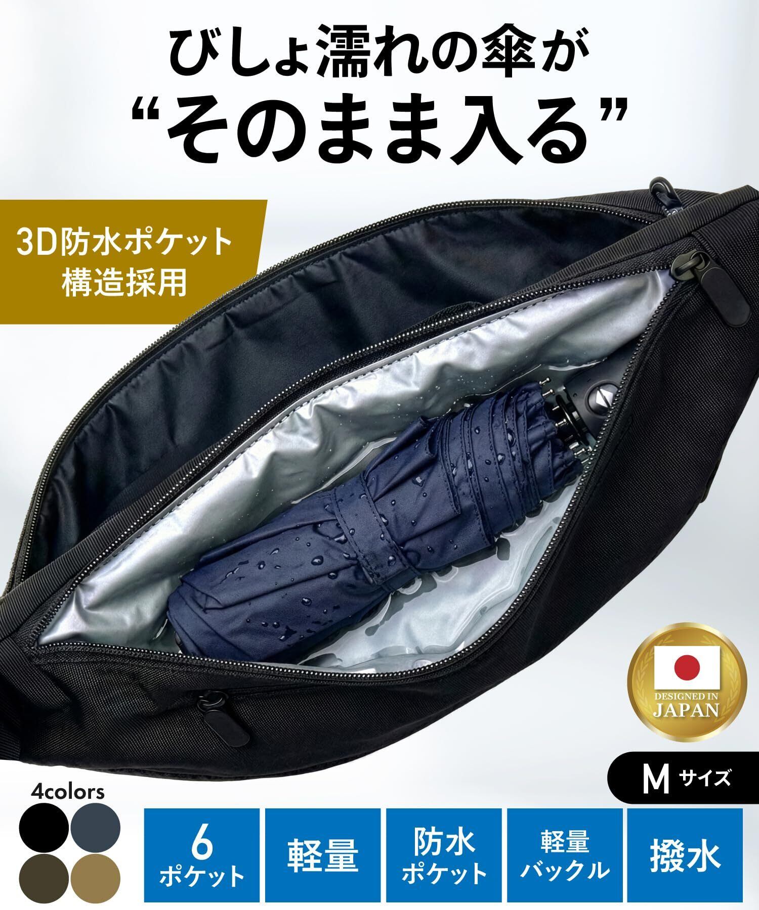 【濡れた傘がそのまま入る、王道ボディバッグ 】濡れたモノをそのまま収納できる便利な防水ポケットが内蔵された見た目はベーシックかつシンプルな王道ボディバッグ 。世代・性別問わず幅広い年代の方にマッチ。日常にも旅にも便利な、まさに“究極”の相棒です。