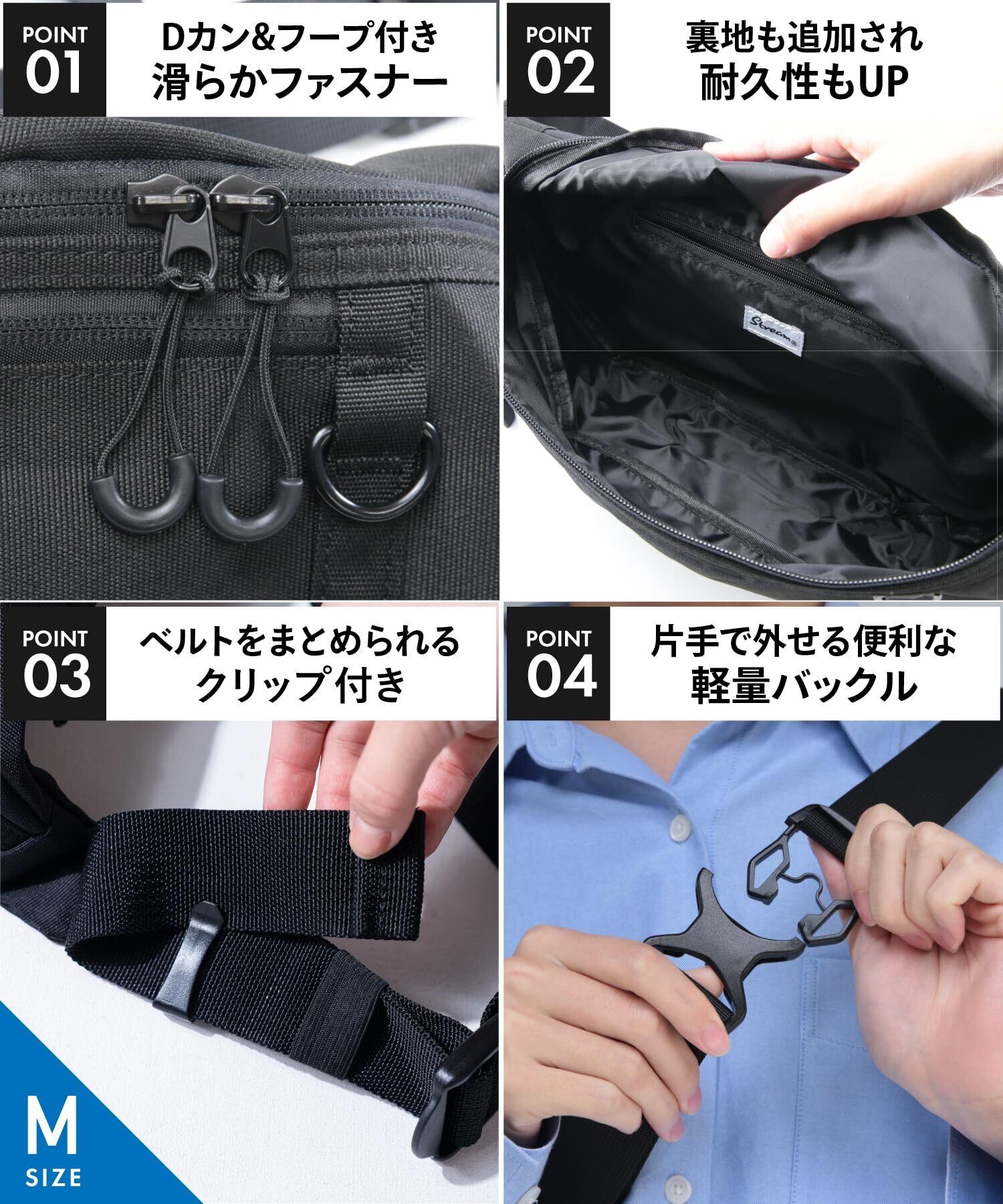 【こだわりの仕様】メインファスナーはDカン&フープ付きで左右どちらからも開閉可能。片手で簡単に取り外しができ長さ調整可能なバックルを搭載しており、ストレスフリーな使い心地を実現しました。軽くて丈夫なナイロン素材で荷物を入れてもシルエットが崩れにくく見た目も荷物の収まりもバッチリ。