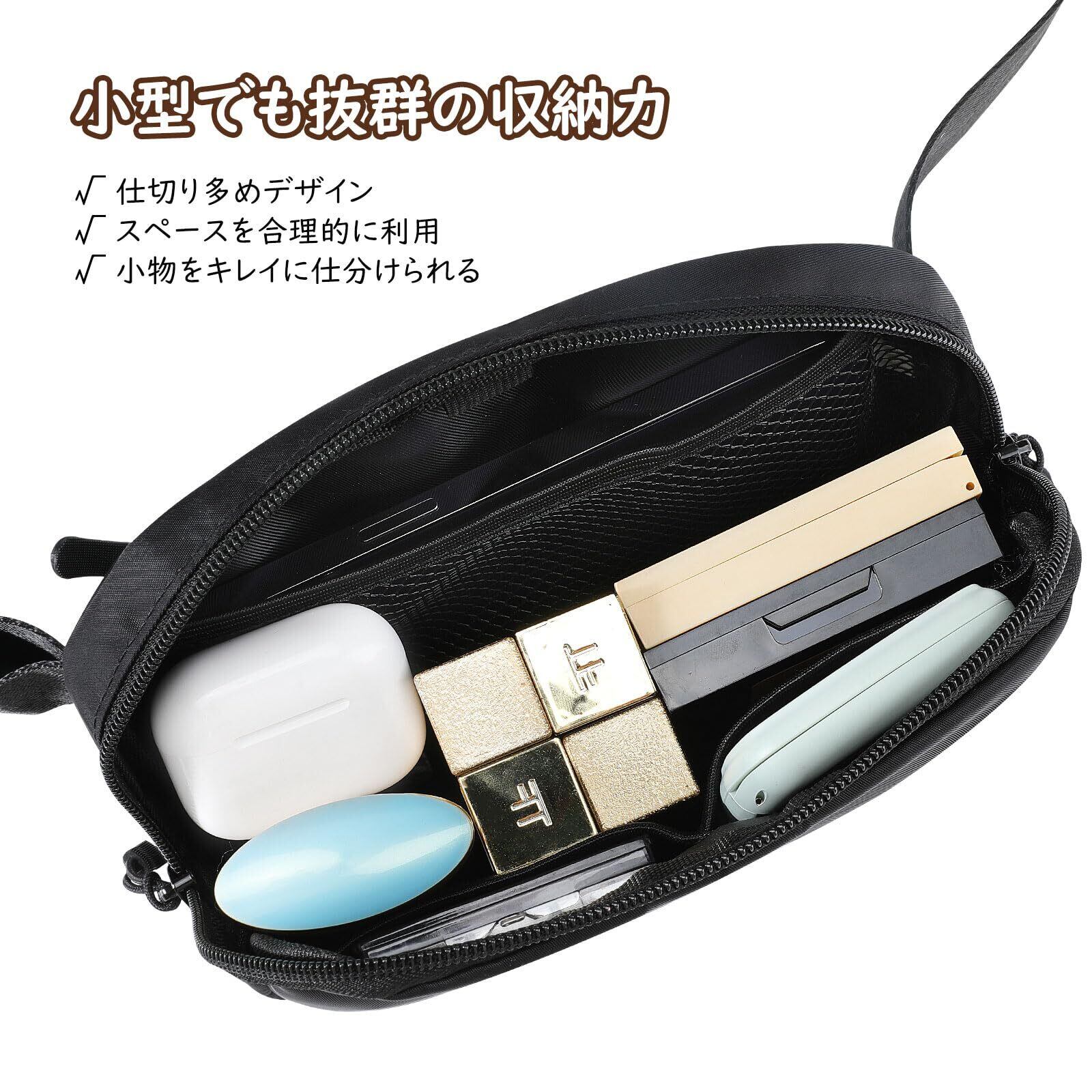 「ミニ型でも抜群の収納力持ち」メイン収納ポケットのほか、小物の仕分けも楽にできる内部メッシュポケットも両側に備えてあります。日常生活によく使われるスマホ、鍵、カード、イヤホン、口紅、ボールペン、ティッシュなどの小物をたっぷり収納可能です。