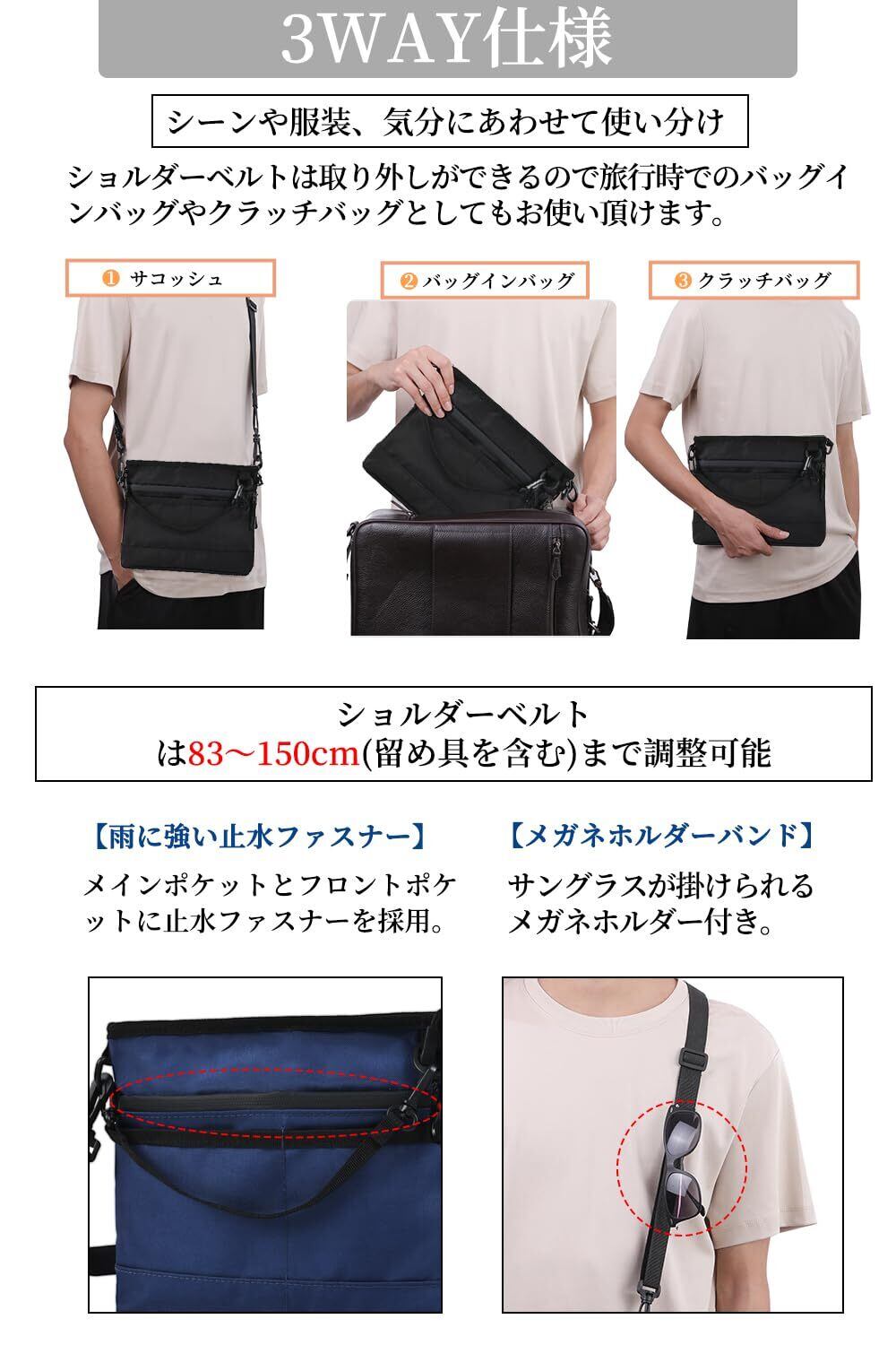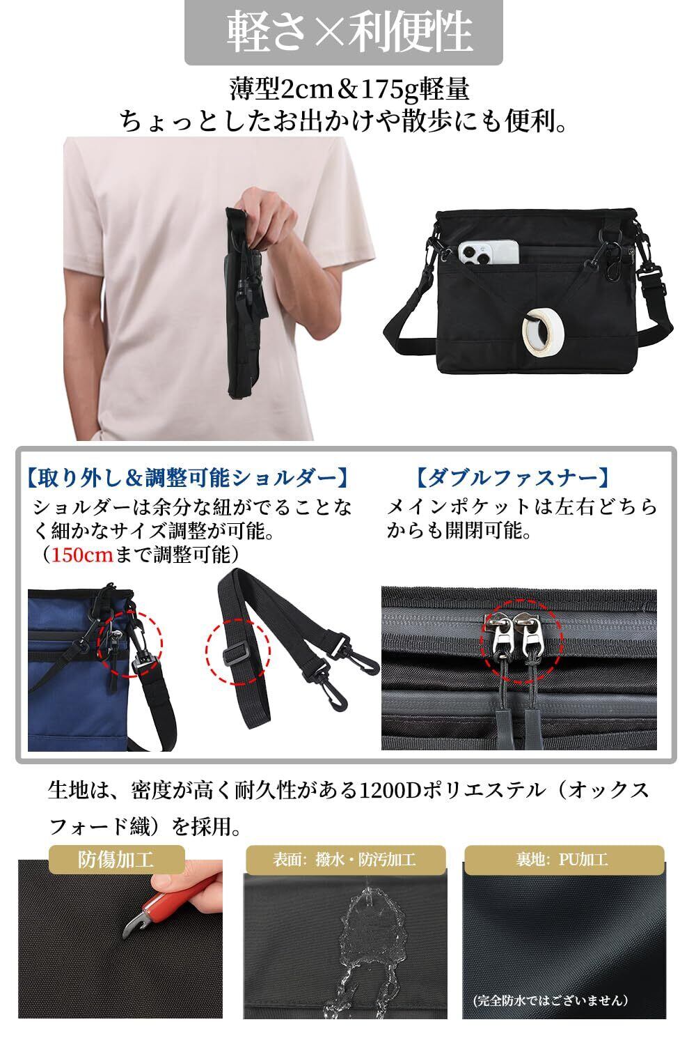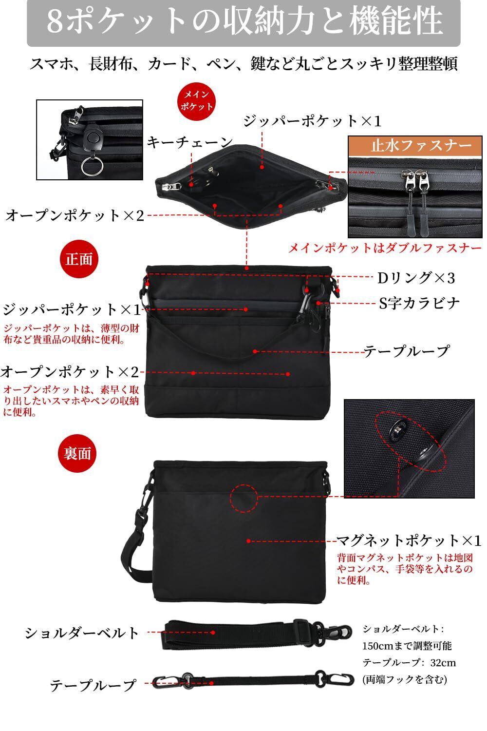 ●軽くて丈夫、シンプルデザイン&多数の便利機能を兼ね備えたマルチサコッシュ。■【 最低限のものを軽快に! 】最低限の持ち物を軽快に持ち歩くことにこだわって設計したサコッシュ。重さはわずか175gで長時間使用でも肩こりや首の疲れを軽減。(ショルダーベルト込みで215g)長財布はもちろん、iPad miniやkindle paperwhiteなどのミニタブレットを収納可能。■【こだわりのサイズ感&8ポケット】2cm薄マチ、コンパクトで、スマホや長財布、手帳や小物を入れるのにぴったりのサイズです。収納ポケットは全部で8個。前面にはオープンポケット(小)×2、止水ファスナーポケット(大)×1、内側には、オープンポケット×2とジッパーポケット×1があり、背面にもマグネットポケット×1が付いています。