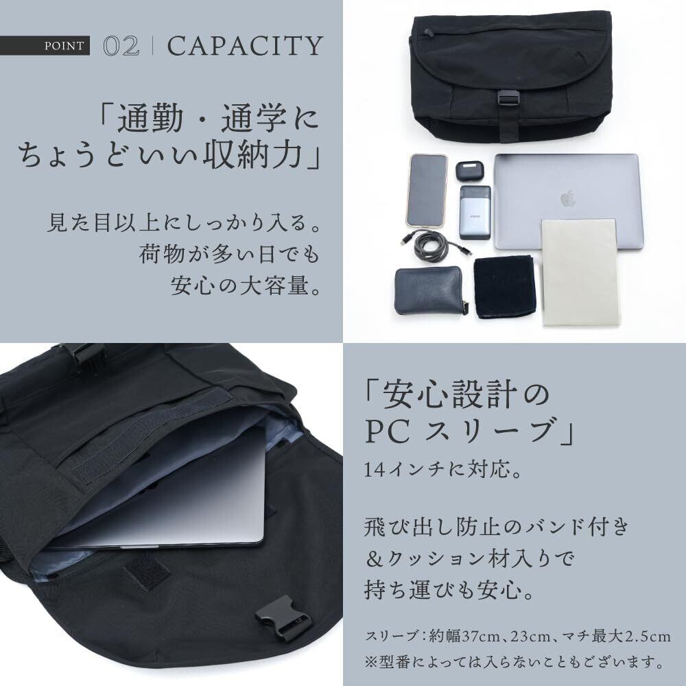 【通勤・通学にちょうどいい収納力】見た目以上にしっかり入る。荷物が多い日でも安心の大容量。 【安心設計のPCスリーブ】14インチに対応。飛び出し防止のバンド付き&クッション材入りで持ち運びも安心。スリーブ:約幅37cm、23cm、マチ最大2.5cm ※型番によっては入らないこともございます。