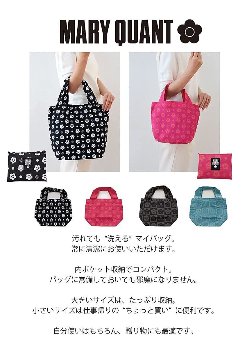 【MARY QUANT】アイコン""デイジー""と市松柄を組み合わせ代表的なデザインです。どんな服装にも合わせやすようワントーンでまとめました。汚れても洗えるので常に清潔にお使いいただけます。 洗えるエコバッグ。 内ポケット収納でコンパクト。裏地付き。 毎日持ち歩いても邪魔にならないサイズ感。ミニサイズは仕事帰りのちょっと買いなどに便利です。