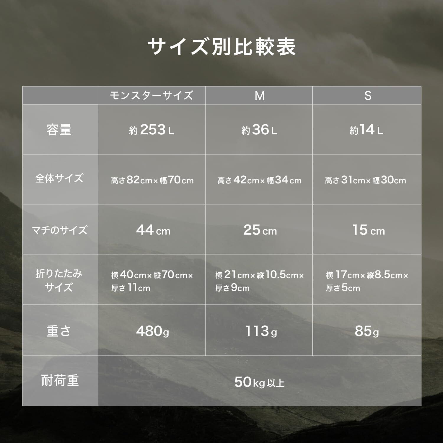 【容量】 (S)約14L (M)約36L 【使用サイズ】 (S)高さ31cmx幅30cm (M)高さ 42cmx幅34cm 【折りたたみサイズ】 (S)横 17cmx縦8.5cmx厚さ5cm (M)横21cmx縦10.5cmx厚さ9cm 【重量】 (S)85g (M)113 g