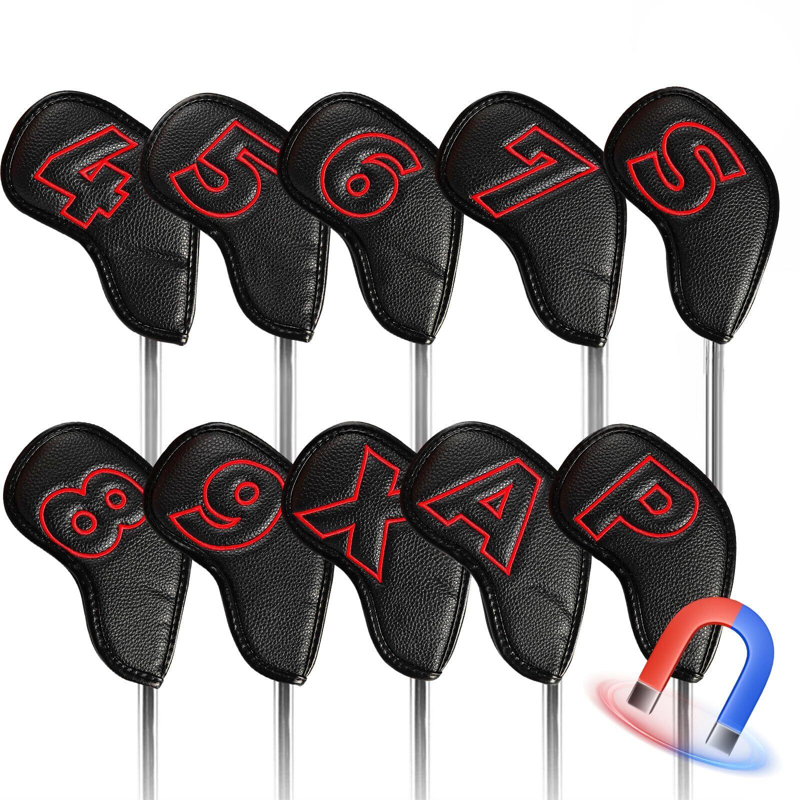 ゴルフアイアンカバー 10枚セット マグネット式開閉 ゴルフヘッドカバー ウェッジカバー 高級PUレザー 軽量 耐久性・撥水性・防塵性・耐摩耗 両面番号刺繍 究極のヘッド保護カバー LT-011