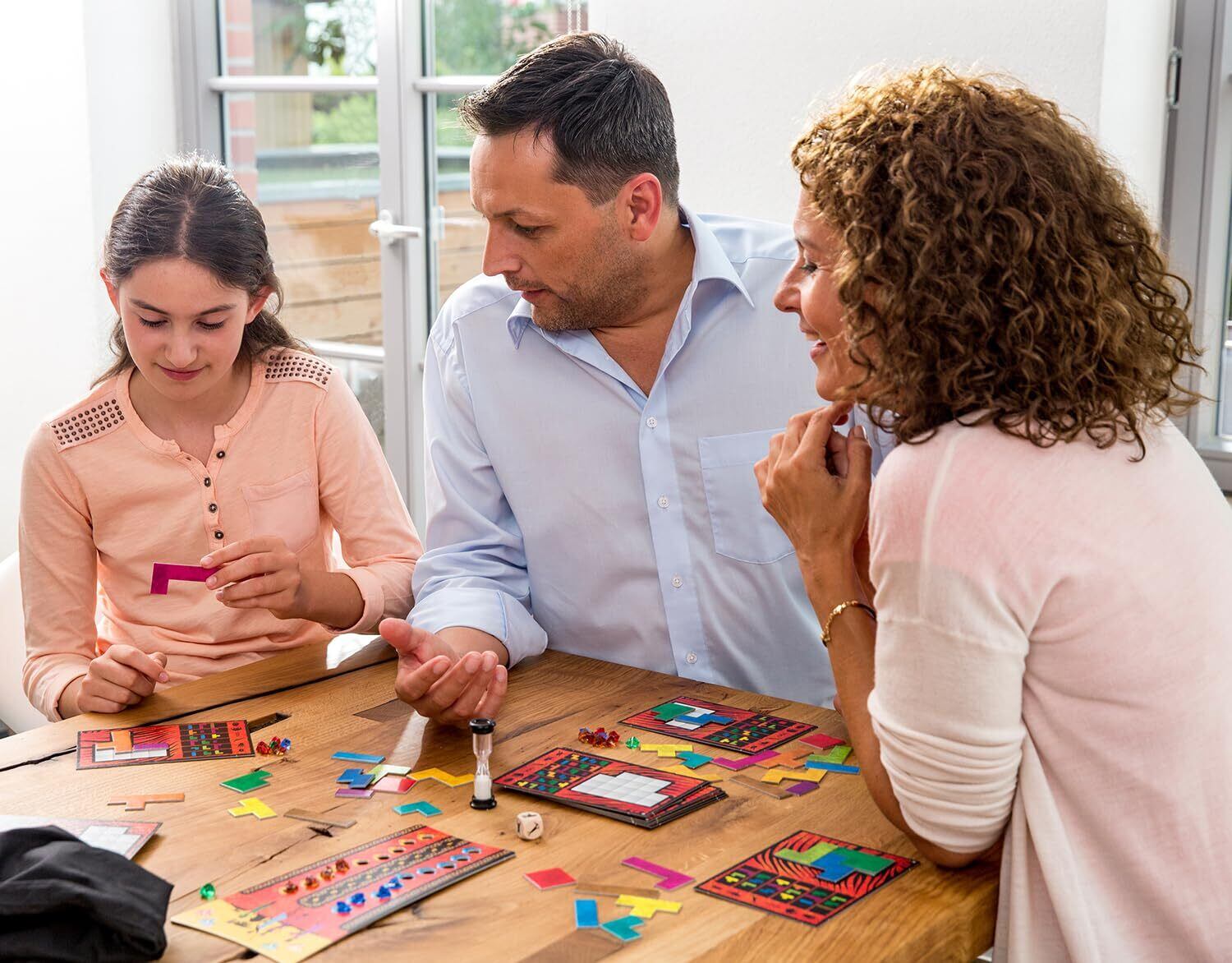 全員同時に、パズルボードに指示されたピースタイルを取り、ボードに書かれている枠にピースがピッタリおさまるように配置するゲームです。