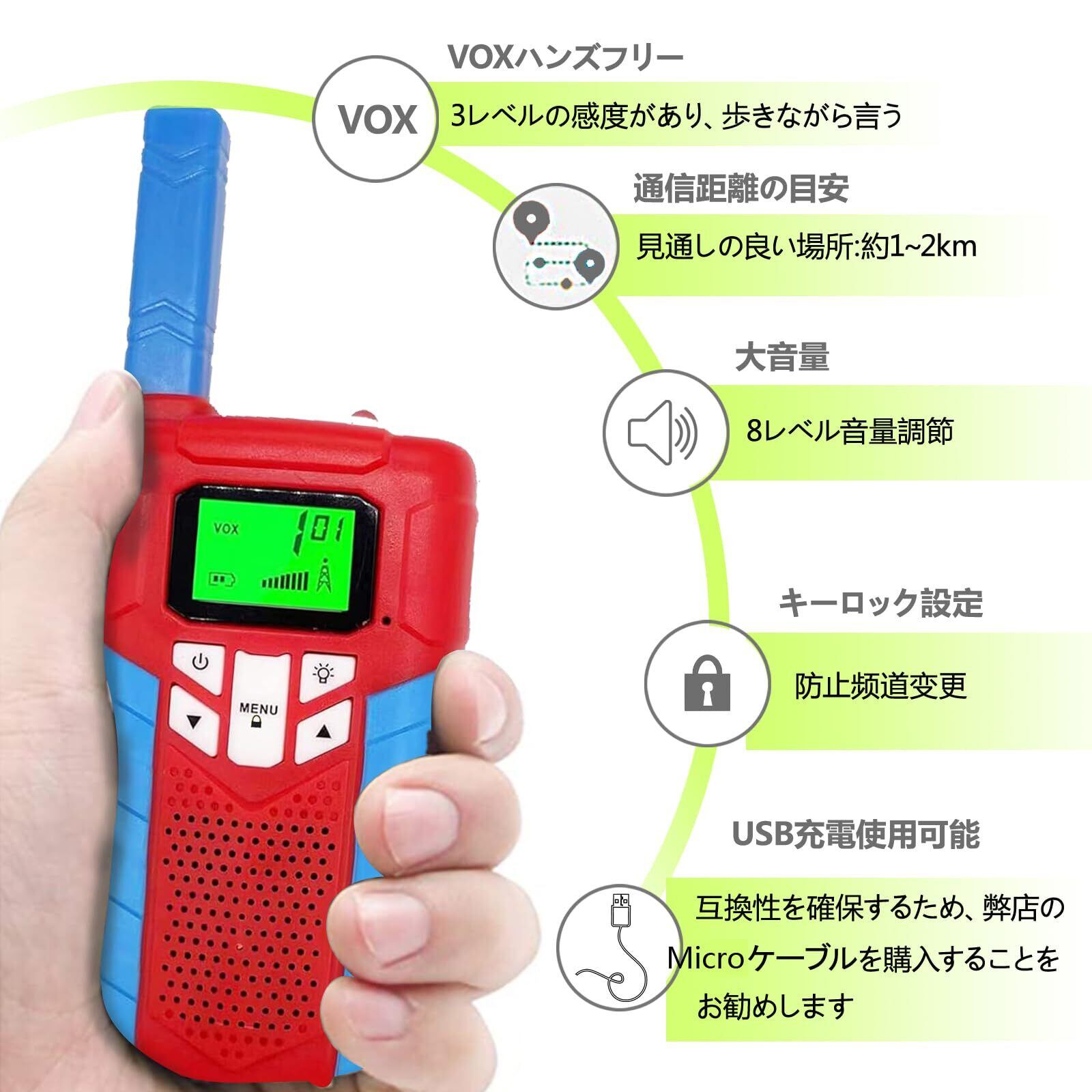 実用的な機能-これおもちゃ トランシーバーはVOXハンドフリー機能付き、ボタンを押しっぱなしにする必要はありませんし、携帯電話のように歩きながら話すこともできます. LED懐中電灯内蔵、耐久性、クリスタルサウンド、自動省電力、ローバッテリーアラーム、オートスキャンチャンネル. USB充電機能は充電式電池の繰り返し使用が可能、環境保護を節約、でき充電機器を見つけるのは簡単です。