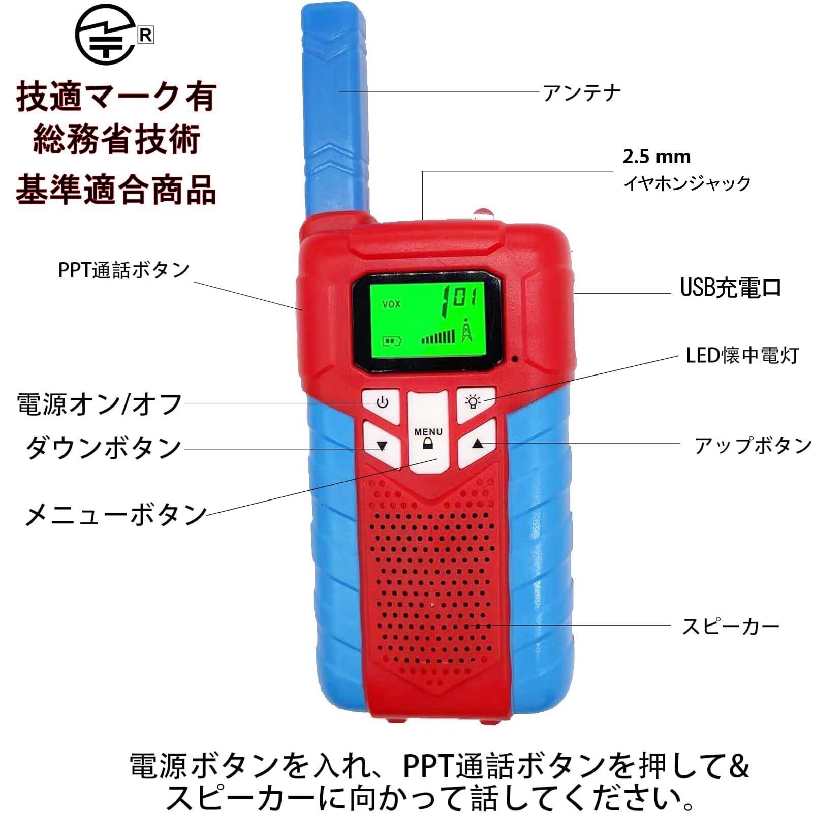 トランシーバー 子供 玩具 おもちゃ 子供用トランシーバー 2台セット 充電式 キッズ 特定小電力トランシーバー 簡単操作 免許資格不要で使用できる USB充電ケーブル 付属 技適マーク有 総務省技術基準適合商品